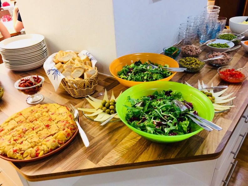 Soon it’s time to eat more: there are salads and vegetables, chorizo, more omelettes, olives, cheese and, of course, bread. Eating a little bit of everything makes feel full easily.