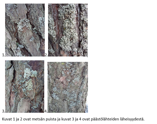 Löysimme männyistä useita jäkälälajeja. Sormipaisukarvejäkälä oli yleisin jäkälälaji tutkimissamme männyissä. Sitä oli sekä tien vieressä kasvavilla männyillä sekä metsässä. Metsän männyissä oli jonkin verran naavoja ja luppoja. Niitä ei kuitenkaan juurikaan esiintynyt päästölähteen läheisissä männyissä.
