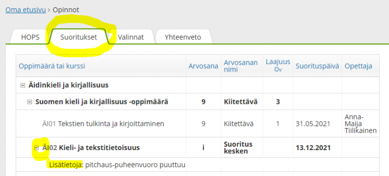 Opiskelija näkee selityksen i-merkinnälle Wilmasta: -> Opinnot -> Suoritukset. Selitys i-merkinnälle aukeaa klikkaamalla valitun kurssin nimen edessä olevaa +-merkkiä.