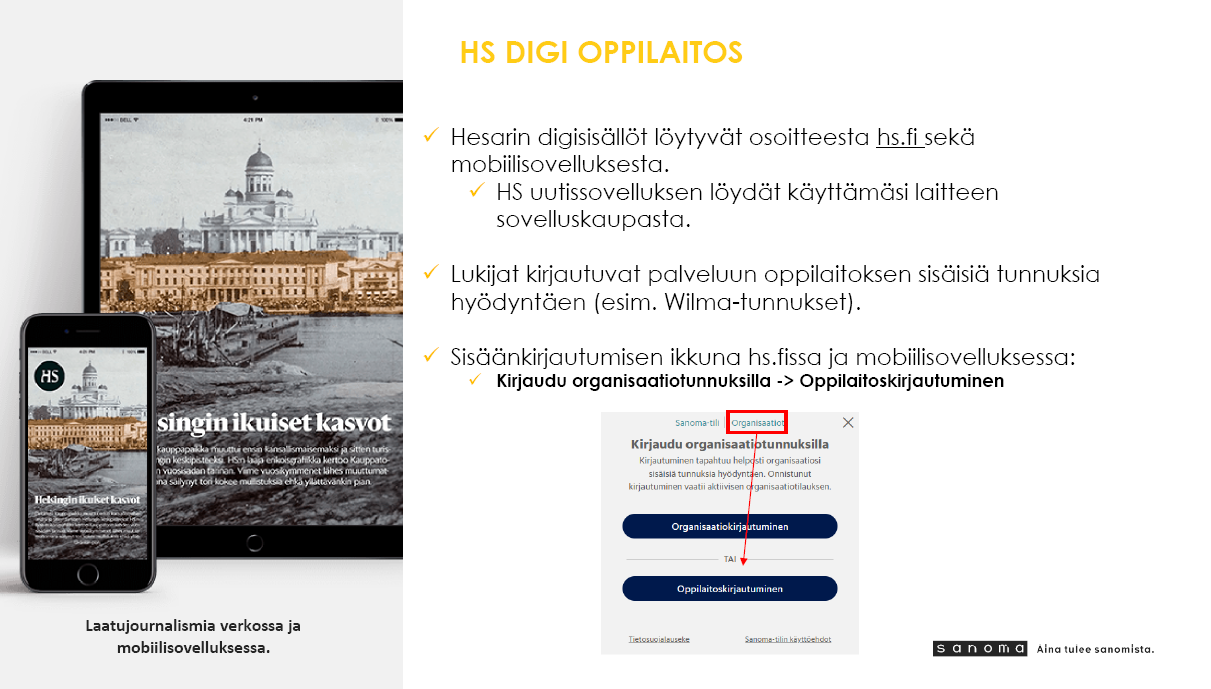 Klassikan opiskelijoilla on käytössä HS Digi Oppilaitos -palvelu. Valitse HS:n sivuilla tai sovelluksessa oppilaitoskirjautuminen, niin palvelu ohjaa sinut MPASSid-kirjautumiseen ja pääset käyttämään HS:n materiaaleja.